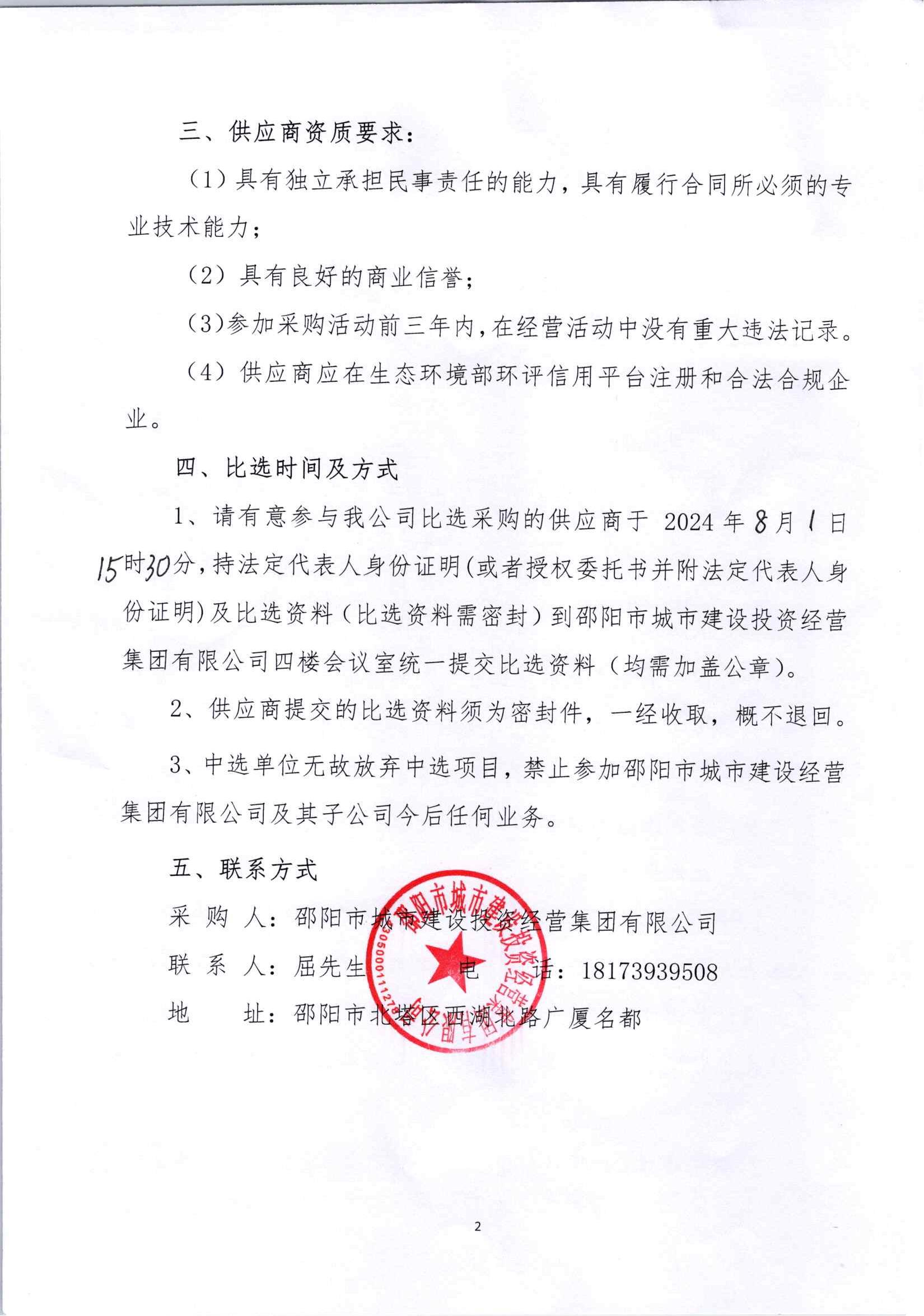 邵陽市城市建設(shè)投資經(jīng)營集團有限公司自來水綠色資產(chǎn)支持專項計劃(暫定名)主承銷商選聘采購項目談判邀請書..