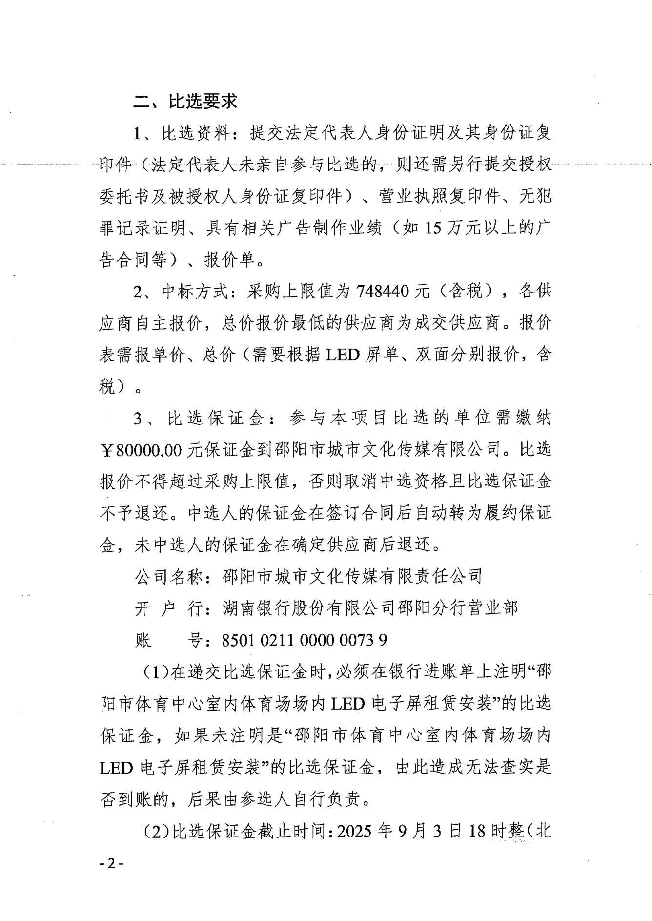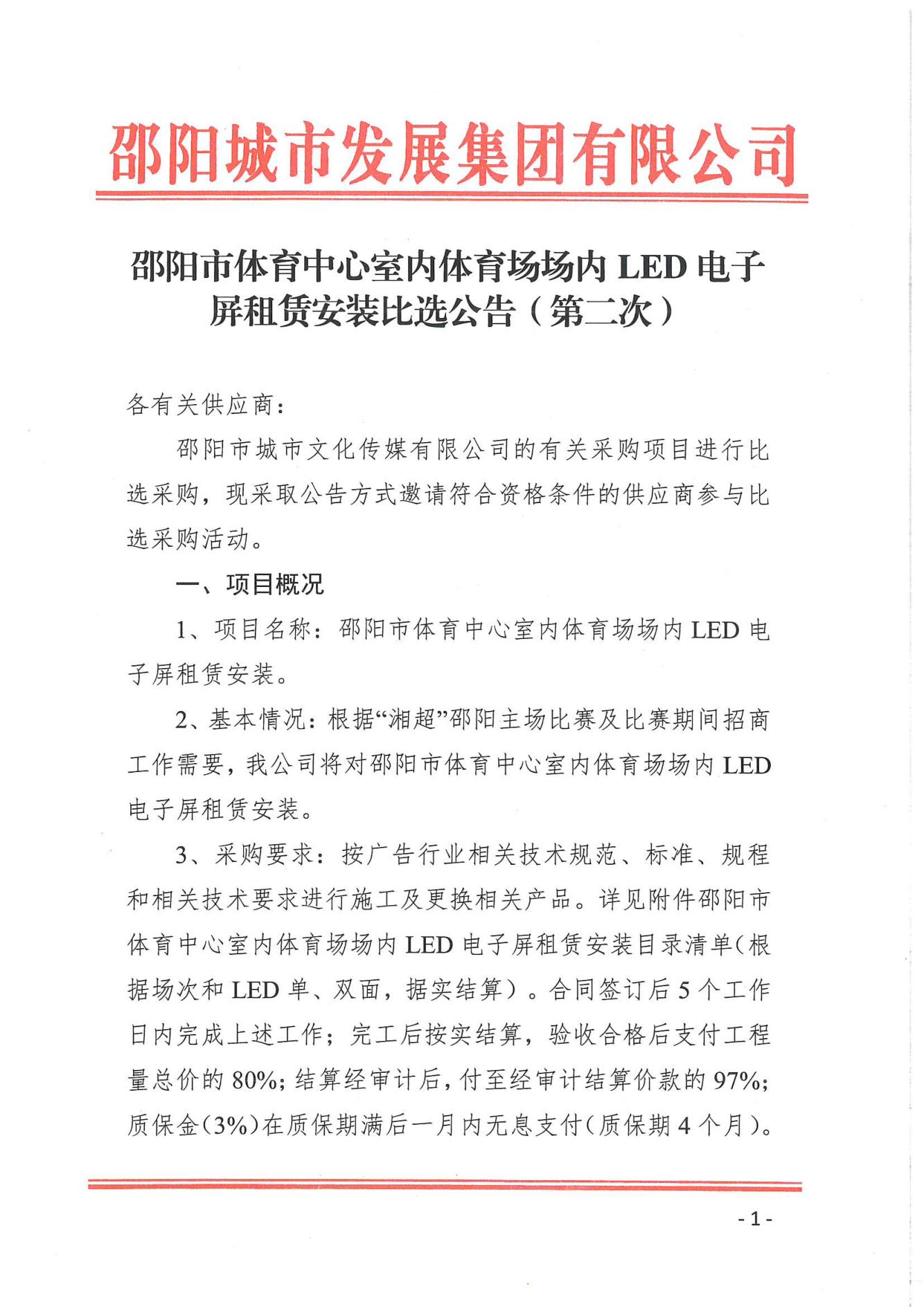 邵陽市體育中心室內(nèi)體育場場內(nèi)LED電子屏租賃安裝比選公告(第二次)..