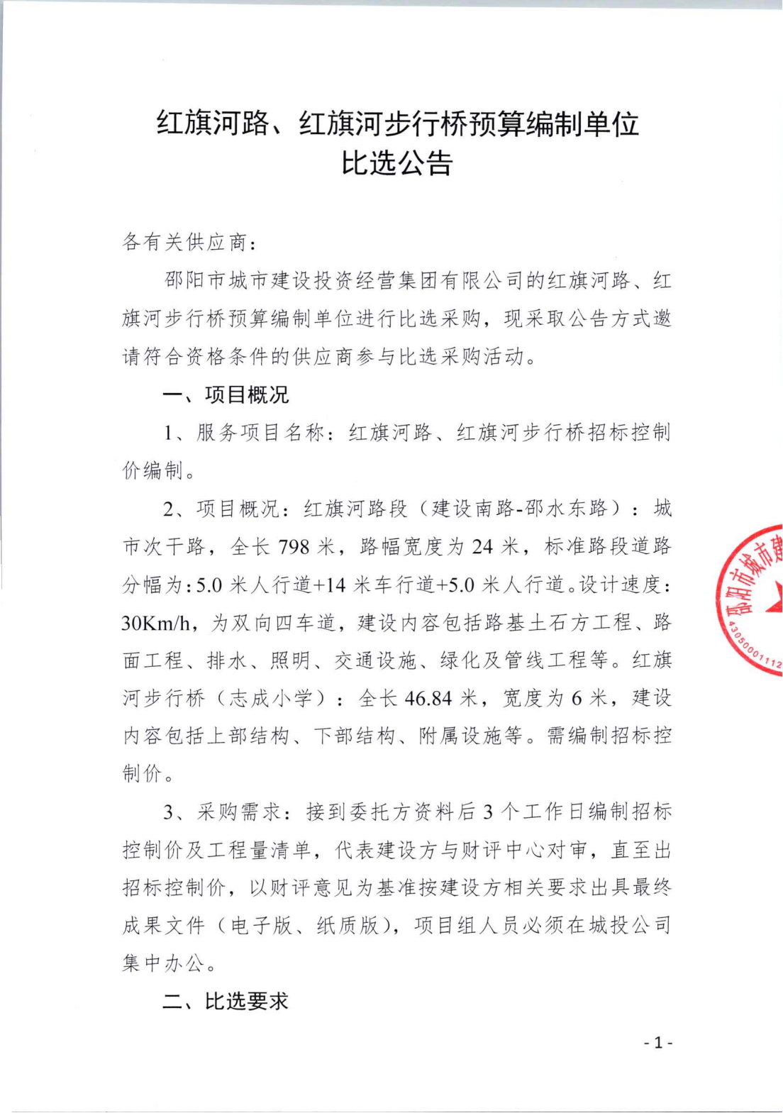 紅旗河路、紅旗河步行橋預(yù)算編制比選公告